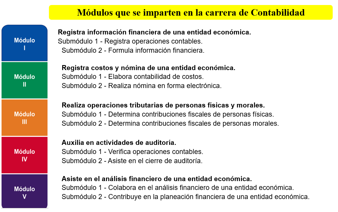 La carrera de Contabilidad del Bachillerato Tecnológico, en el nivel medio superior, tiene por objetivo formar técnicos con una preparación propedéutica que les permita continuar estudios a nivel licenciatura en el área económica-administrativa, así como una formación tecnológica que los capacita en la práctica de los conocimientos técnicos para el manejo de los sistemas contables y financieros, aplicables a diversas áreas como son: auditoria, costos, presupuestos, aspectos fiscales, así como registrar las transacciones de egresos e ingresos y su control interno, en función de las necesidades específicas de la organización en donde se desempeña profesionalmente.